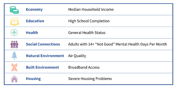 The Common Community Scorecard includes seven indicators that reflect the interconnected systems shaping every community’s quality of life.